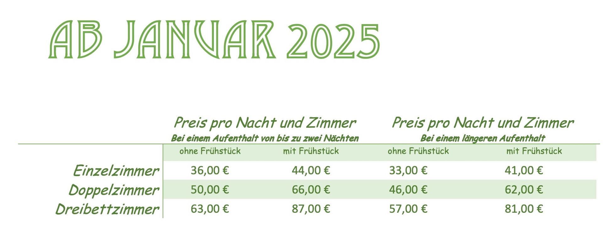 wir möchten Sie darüber informieren, dass wir auf Grund der steigenden Energie- und Lebensmittelkosten ab dem 01.01.2025 eine Preiserhöhung für unsere Leistungen vornehmen müssen.